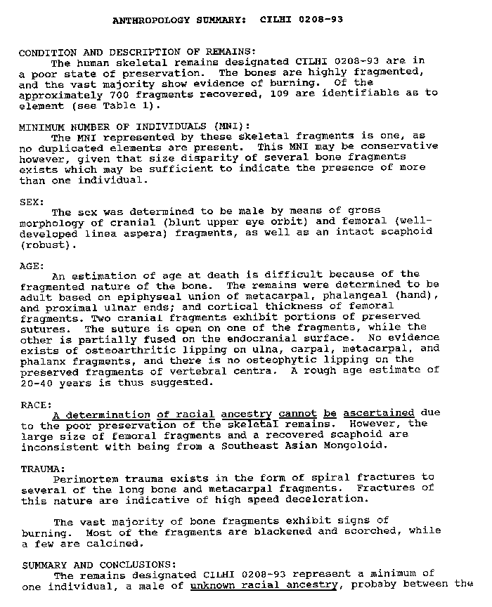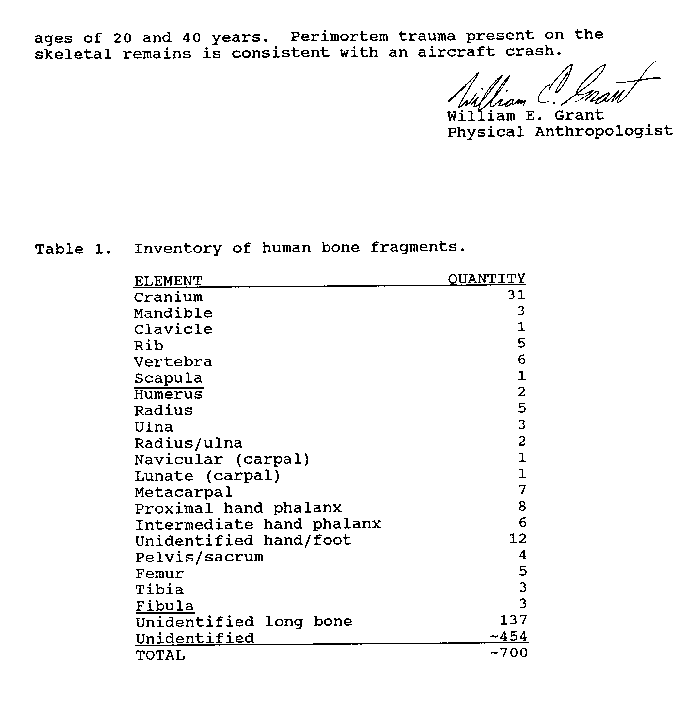 ![]() The conclusions of Grant are not really conclusions but speculation. Of the 700 bone fragments, 591 were not identified at all! Only 109 fragments were identified as possibly male human fragments. What about the majority of the fragments? Are any pieces female? Are any consistent with a Southeast Asian Mongoloid? Grant has based his conclusions on a few femoral fragments and one scaphoid fragment. Now I don't know what part of the body these come from, but common sense would say it is foolish if not impossible to draw these conclusions based on less than 1% of the bone fragments. |