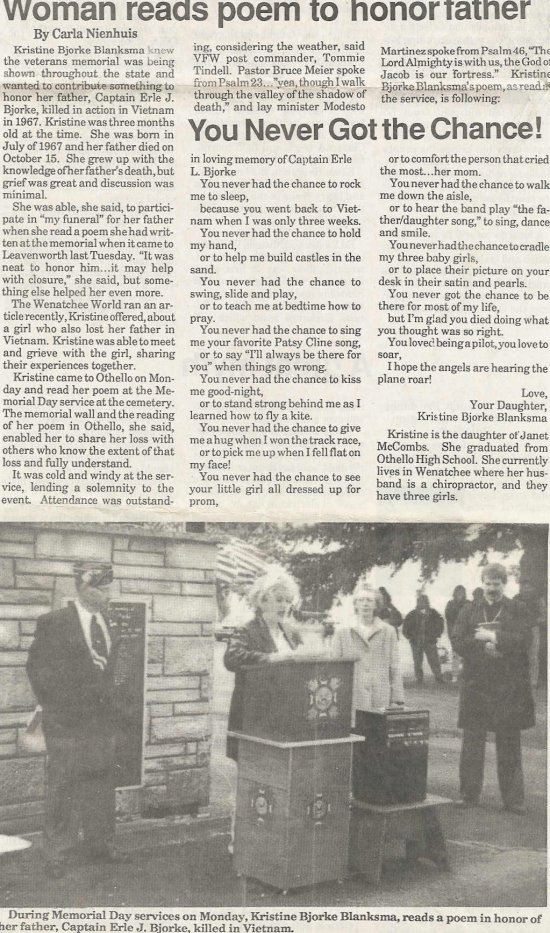 | As I stood by the "Traveling Wall" and placed my things a Col. stood behind watching me. He said, "Do you mind if I read it?" I said, "I would be honored." As he stood with tears in his eyes he said, "Can you read this without crying?" I responded, "Absolutely" and I did! That started my devotion of my time to honoring my fathers memory. |